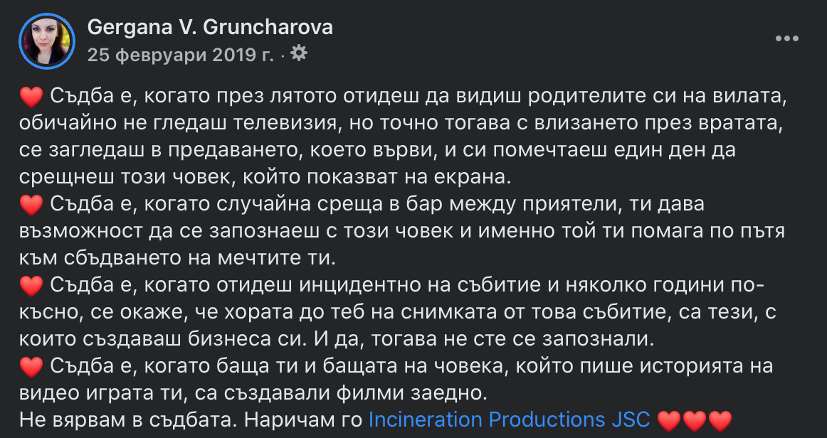 След това последва дълъг период, в който изобщо не съм се интересувала от видео игри. Завърнах се към гейминга на 22 – 23 години, когато преоткрих страстта си към action-adventure жанра. Няколко години след това с Юрий създадохме Incineration Productions.